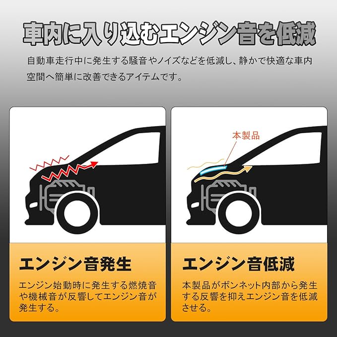【エンジン音を低減】自動車走行中に発生する騒音やノイズなどを低減し、静かで快適な車内空間へ簡単に改善できるアイテムです。