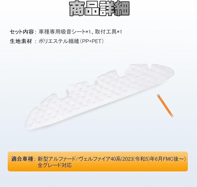 【適合車種】アルファード ヴェルファイア 40系、全グレード対応、R5.6~現行。※注意事項:年式・グレード・オプション等により適合しない場合が御座います、よく製品形状とお車をご確認頂き、お買い求め下さい。セット内容:車種専用吸音シート*1、取付工具*1。生地素材:ポリエステル繊維(PP+PET)。