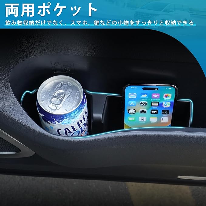 4.【スペース分け】:ドアポケットはサイズの異なる収納エリアに分割され、飲み物、鍵だけでなく、さまざまな小物の収納にも使える。