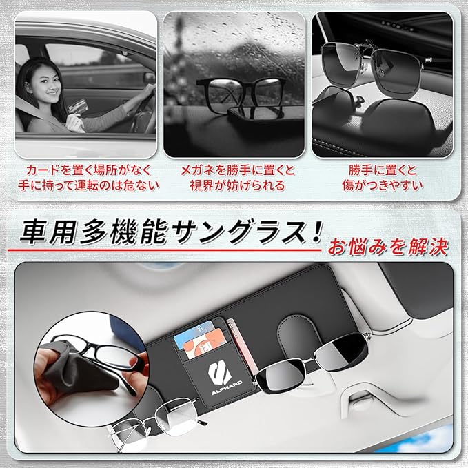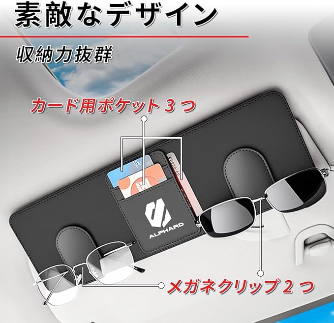 アルファード カー サングラスホルダー メガネクリップ2つ カード用ポケット3つ サンバイザーに嵌め込む 対応 Alphard 40系 30系 20系 しっかり固定 PUレザー マグネット式 使いやすい 車 アクセサリー 大きいサイズ メガネクロスをプレゼント