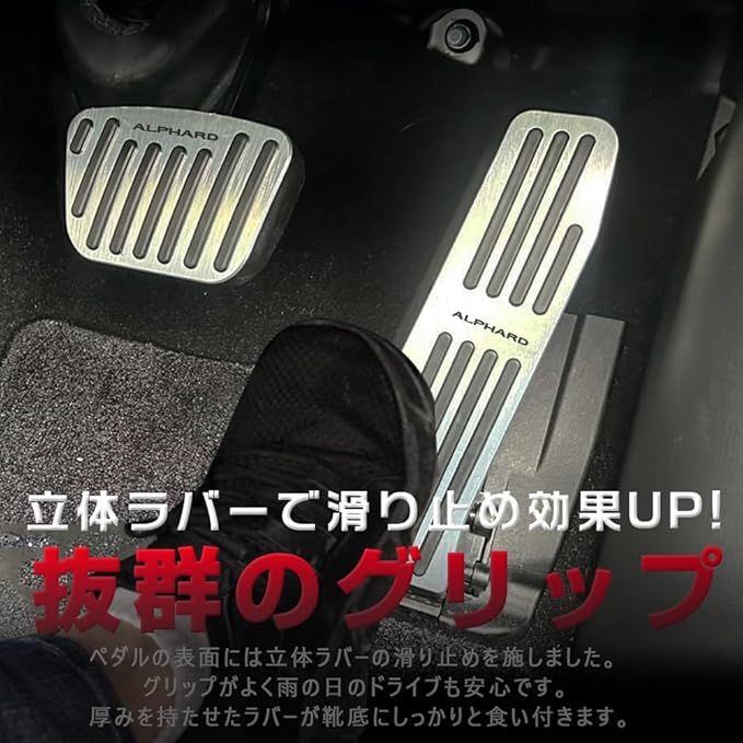 【取付簡単】:ペダルへの穴あけ等の加エや特別なエ具が必要無いポン付け仕様。新手でもすぐに取り付け可能! 【取付方法】:1.アクセルペダルは純正ペダルの上から本製品を被せてください 2.ブレーキペダルは純正のゴムカバーを取り外してからお取付ください