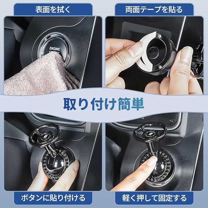 【取付簡単 跡が残らない】この車用ワンタッチスタートレバーは、取り付けがとても簡単です。まずは表面をきれいに拭きます。次に、車用ワンタッチスタートレバーに両面テープを貼ります。最後に、スタートボタンに貼り付けて、軽く押して固定するだけです。高品質なナノ両面テープを使用してしっかりと接着されており、長期間使用しても剥がれることはありません。取り外しが簡単で、取り外した後も跡が残ることはありません。