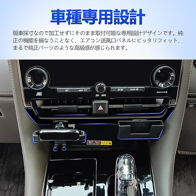 【車種専用設計】現車採寸なので加工せずにそのまま取付可能な専用設計デザインです。純正の機能を損なうことなく、エアコン送風口パネルにピッタリフィット、まるで純正パーツのような高級感が感じられます。