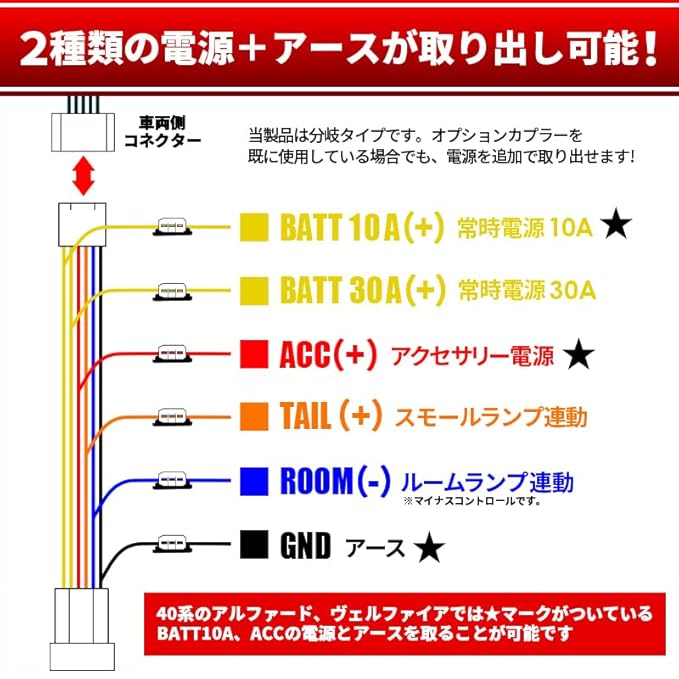 アルファード ヴェルファイア 40系対応 電源取り出しオプションカプラー 分岐型 I字タップ付属