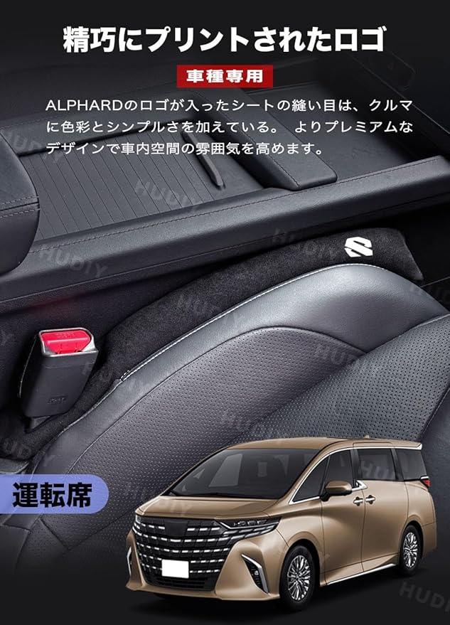 HUDIY(フーディ)車 隙間クッション 新型アルファード 40系 車用 シートサイド隙間埋め ALPHARD 40系 (2023年6月~現行) スエード シートコンソール サイドクッション 一体成形 車用座席漏れ防止ストリップ センター 運転席 助手席 ゴミ小物類 落下防止 プリントロゴ入り小物入れ 2本セット