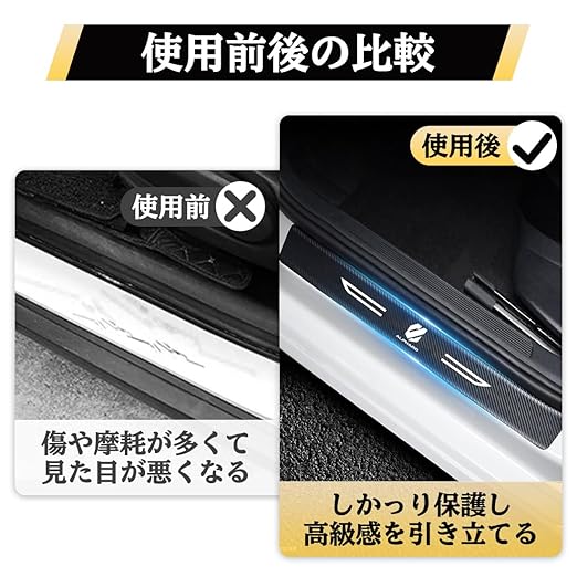 【取り付け簡単・工具不要】この車用スカッフプレートは、裏面に高品質な強力両面テープが付いており、サイドステップに貼るだけで簡単に装着できます。粘着力が非常に強くて、簡単に脱落することがありません。特別な道具や技術は必要なく、短時間で取り付けることが可能です。取り外した後も跡が残りにくく、安心してご利用いただけます。ご注意:本製品は折りたたんで出荷するため、折り目がついているのは正常な現象です。折り目が浮き上がらないように、貼り付ける際にはカードなど平らなものでこすって伸ばしてください。