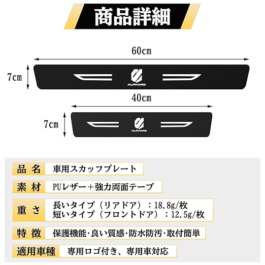 【専用ロゴ付き 高級溢れ】この車用スカッフプレートの表面は、カーボン調のデザインが施されており、非常に高級感があります。専用のロゴが付いていて、サイドステップに独特な雰囲気を与えます。また、深みのあるブラックカラーは、違和感なく愛車に溶け込みます!適用車種:アルファード 20系 30系 40系