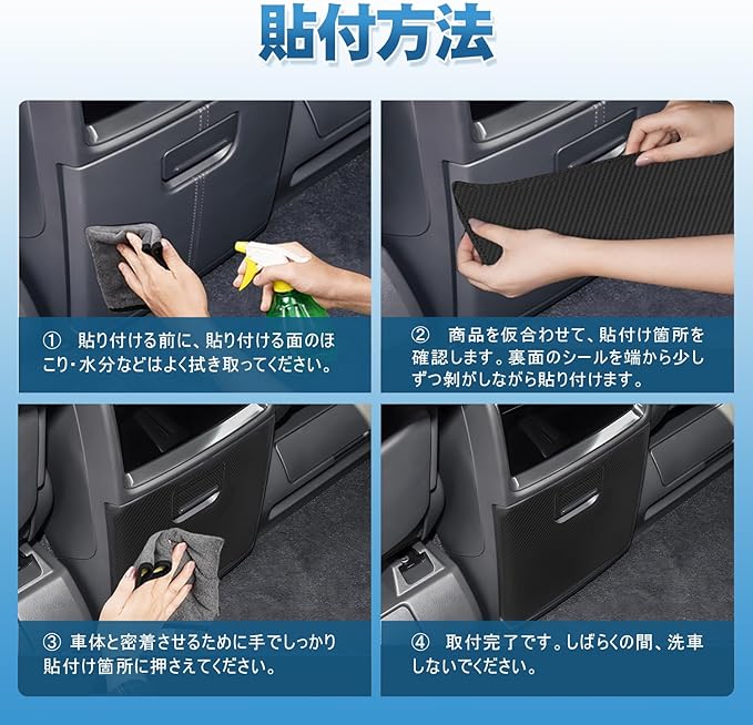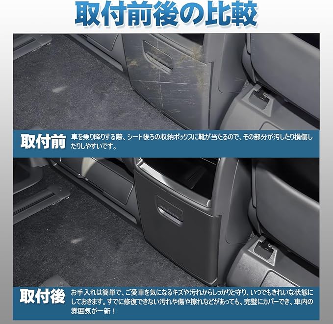 【適合車種】アルファード ヴェルファイア 40系 Zグレード専用、2023年~現行。※この製品はZグレードのみ適合いたします。Excective Loungeは適合対象外なので、ご注意くださいませ。Excective Loungeの持ち主は本製品のご購入をご遠慮ください。セット内容:キックガード2枚セット、設置場所:リア用収納ボックス。色:ブラック。丸めて梱包しておりますので、多少シワが付いております。シワに関しては時間が経過すると解消します。気になる方はご注意くださいませ。