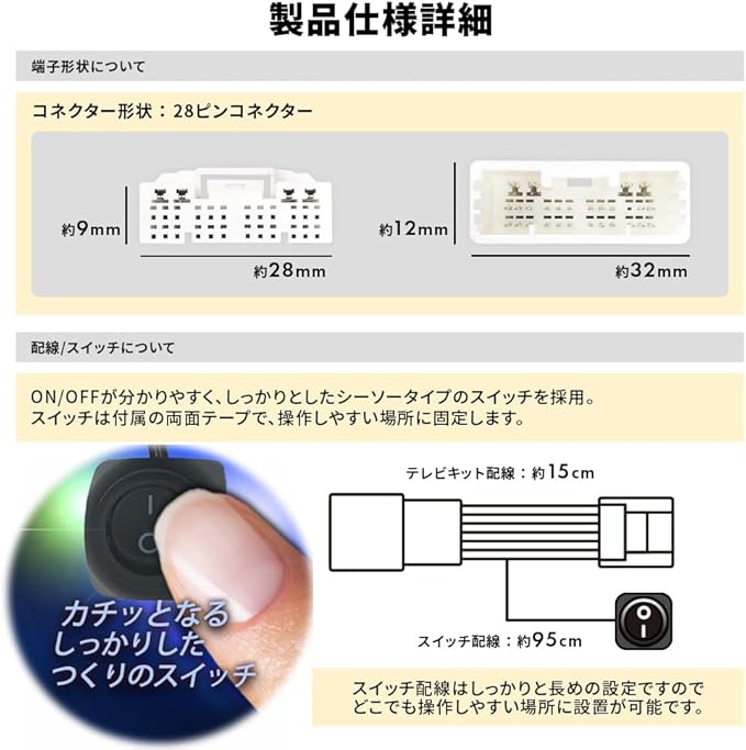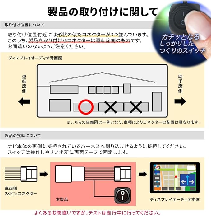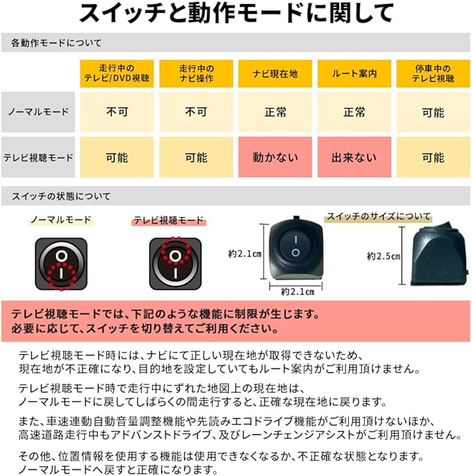 ■商品について ・自動車が走行中もテレビ、DVDの視聴が可能に! ※DVDの視聴については再生機能がある機種に限る ・スイッチOFF時は走行中のナビ操作も可能になります。 ・スイッチには両面テープが付いていますので  お好みの場所に貼り付けるタイプです。