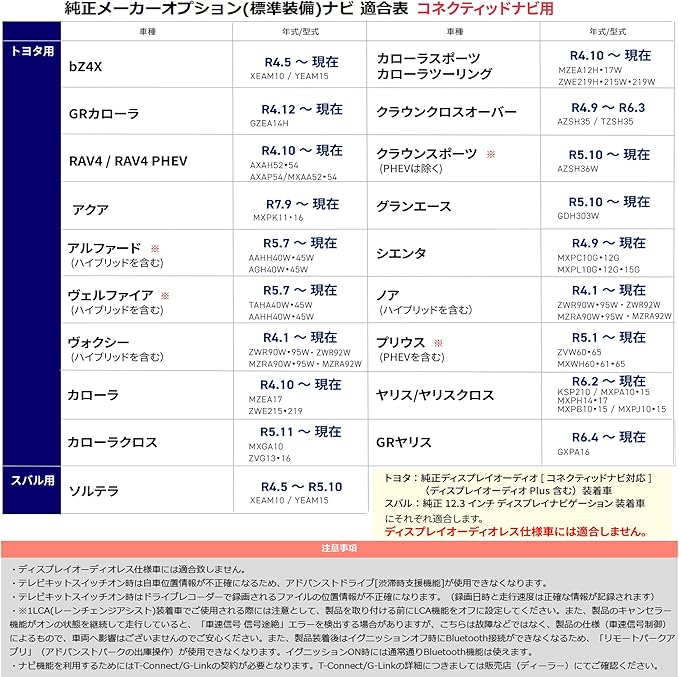 お客様の選んでいただいた車種専用の 取説を同梱いたします! トヨタ純正メーカーオプションナビ ディスプレイオーディオ (plus) (コネクティッドナビ対応)装着車に対応しています。 ※ディスプレイオーディオレス車には適合しません。