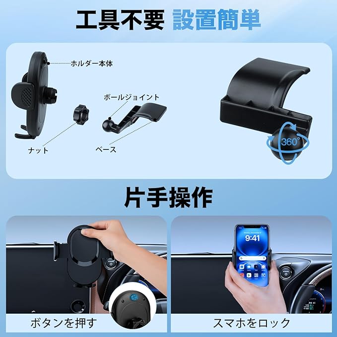 5.【セット内容】:ベースx1pcs、スマホホルダーx1pcs、ボールジョイントx1pc。ご注意:取付説明書は付属しておりません。製品ページを参考にして下さい。【製品素材】:スマホホルダー:高品質ABS樹脂製 (耐高温)。ベース:耐熱PC素材。