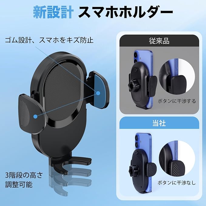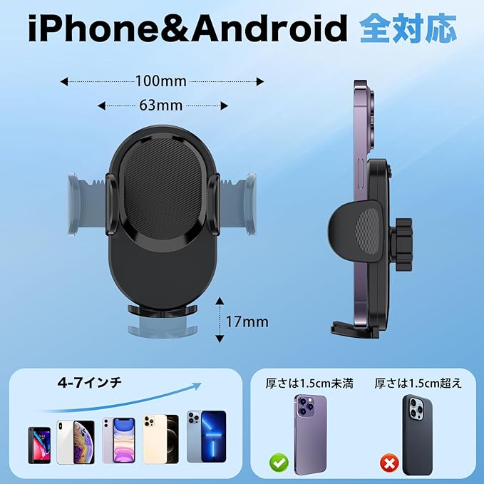 3.【幅広いスマホ対応・ボタンに邪魔なし】:本スマホホルダーの下支えは三段調整可能で、スマホによって、スマホの電源や音量ボタンに邪魔する場合があるかもしれませんが、下支えを適合な位置を調整して、その邪魔する状況を避けれます。4-7インチのスマホに適用しています。例えば:iPhone 16/15/14、Galaxy S24/S23/S22など、市場の主流のスマートフォンと互換性があります。