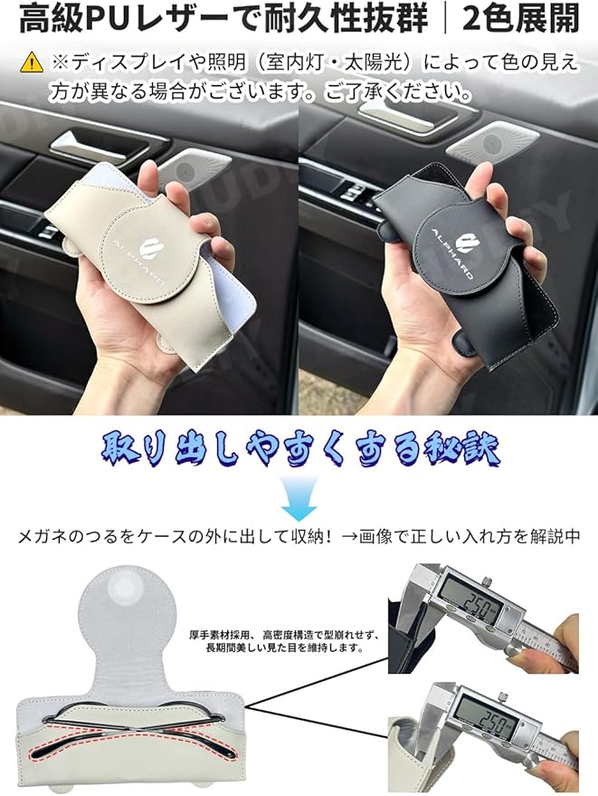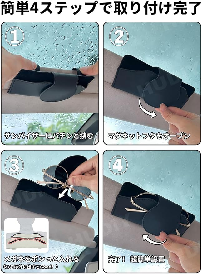 [HUDIY] フーディ 車載用 サングラスケース 専用ロゴ サングラスホルダー 遮光板取り付け型 磁気フタ PUレザー メガネケース 車内収納 運転中簡単アクセス