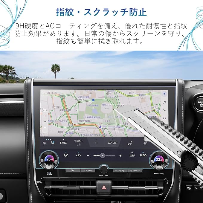 【9H強化ガラス】ガラスフィルムは9H硬度を誇る特殊な強化技術により、鍵や硬貨、スマホなどの鋭利な物からもスクリーンをしっかり守ります。優れた耐久性で、日常的な衝撃や傷からカーナビスクリーンをガードし、長期間にわたり美しい状態を保ちます。不可欠な アルファード 40系 ヴェルファイア アクセサリー です。