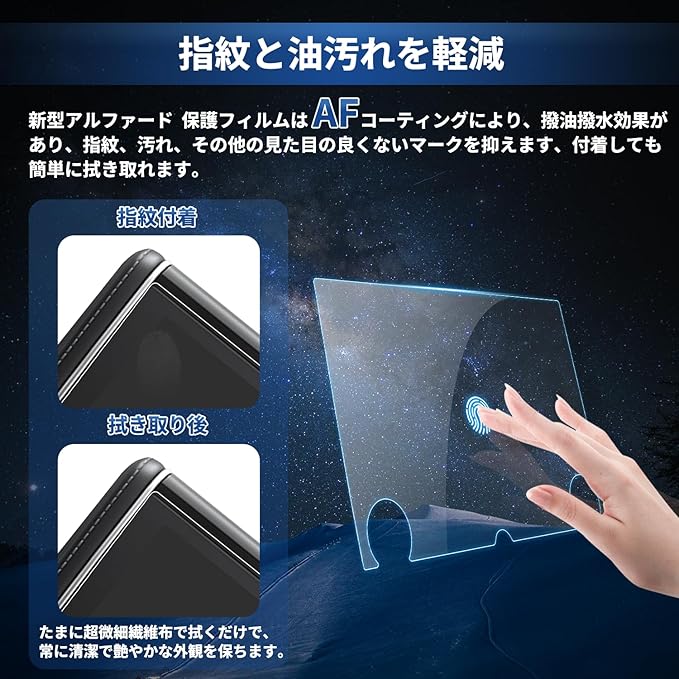 【強力防御で画面を保護】40系 ヴェルファイア アクセサリーは高硬度 (9H) で、鍵や硬い物による 引っかき傷・細かな傷から液晶をガード。強化ガラス採用 で衝撃に強く、万一の時も 破片飛散防止。撥油撥水コーティング (AF/フッ素加工) で 指紋・皮脂・汚れが付きにくい! 付いても サッと拭くだけ でピカピカに。帯電防止 でホコリも寄せ付けない。