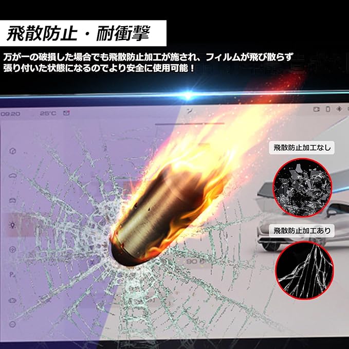 【9H硬度・傷防止】:耐衝撃性を備える保護フィルムは、9Hと高い硬度を誇る強化ガラスを採用しております。保護ファイルは飛散防止技術が加わり、保護ファイルが割れても破片が飛び散らず、車内の人の安全が確保されます。