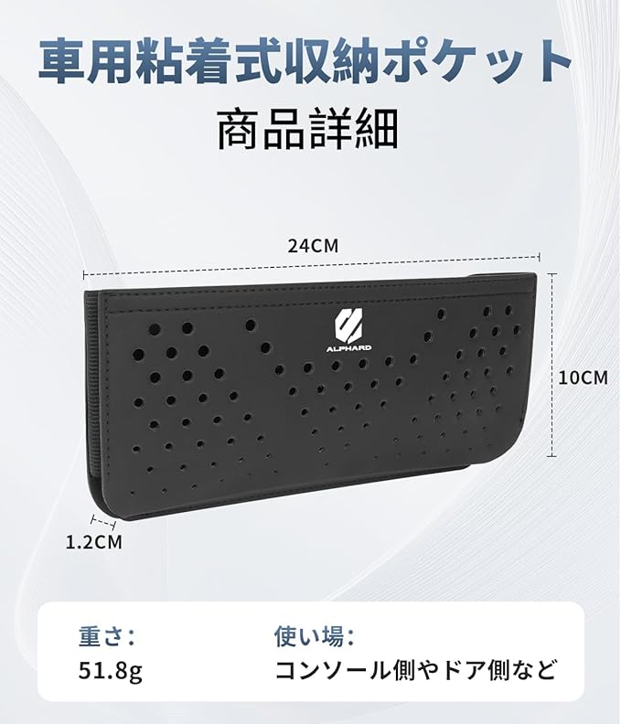 【サイズ・ご注意】このカー粘着式収納ポケットは24cmの長さで、10cmの高さと1.5cmの奥行きがあります。メッシュのスタイルは51.8gの重さがあって、穴あきのスタイルは56.5gの重さがあります。