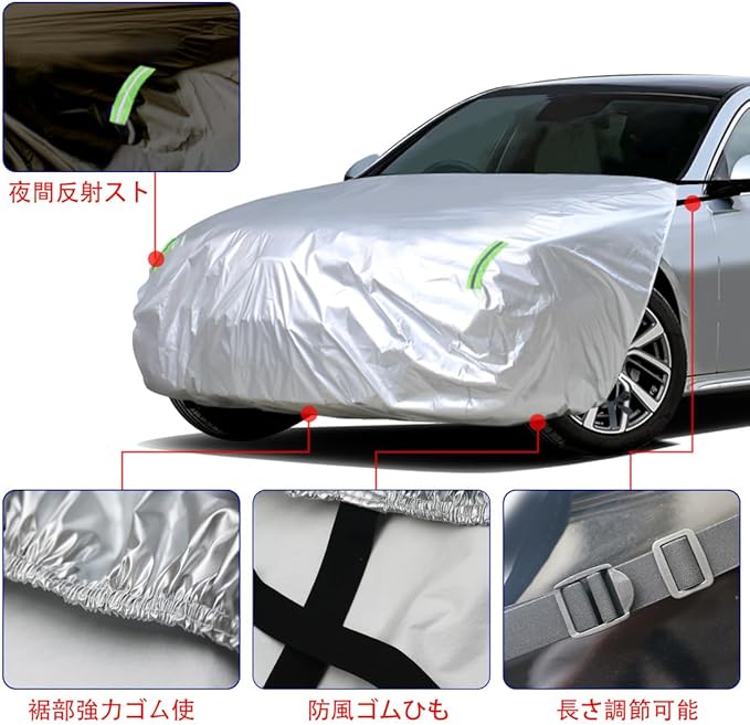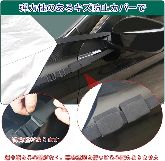 【底部防風デザイン】車カバーの底部に防風ゴムひもを取り付け、台風や嵐の時に車カバーが飛ばされる心配がありまん。