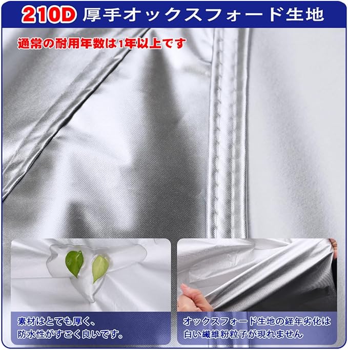 【素材品質】210D厚手オックスフォード生地、通常オックスフォード生地よりも丈夫で厚手です。素材が経年変化しても白い繊維は出ません。異なる環境で使用するため、通常1〜3年使用できます。車カバーの裏側起毛素材で、肌触りが良く、車の塗装をしっかりと保護します。