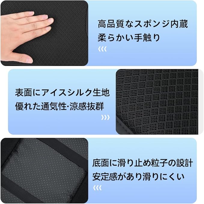 【アイスシルク生地 涼感抜群】この車用アームレストクッションは、アイスシルク素材を使用しており、触れると涼しさを感じ、通気性も非常に優れています。長時間腕を置いても、蒸れやべたつきが生じることはありません。独自の通気孔のデザインにより、熱を素早く放出し、快適なドライブ体験を提供します。