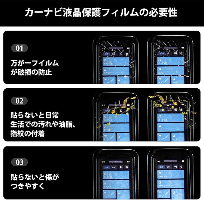 高硬度「9H」の強化ガラス:5つの層で薄くて鮮やかで強いガラスフイルムを実現。最近は液晶パネルに直接指でタッチしたりします、液晶画面は傷がつきやすいです。リヤマルチオペレーションパネルを長く大事に使っていきたいなら、このカーリヤマルチオペレーションパネル専用保護フィルムをおすすめです。キズや衝撃から端末を守ります。