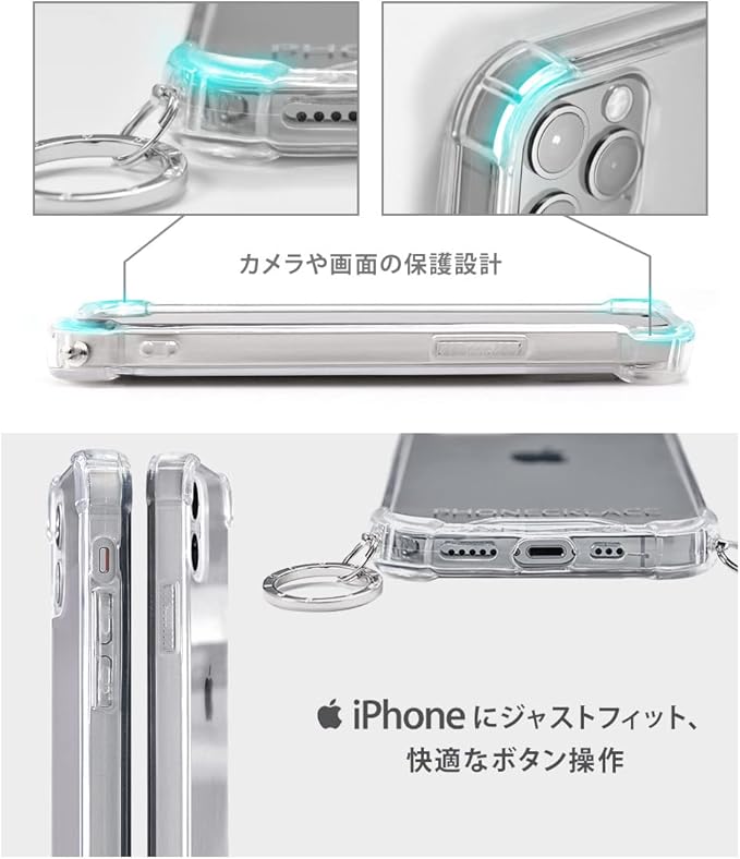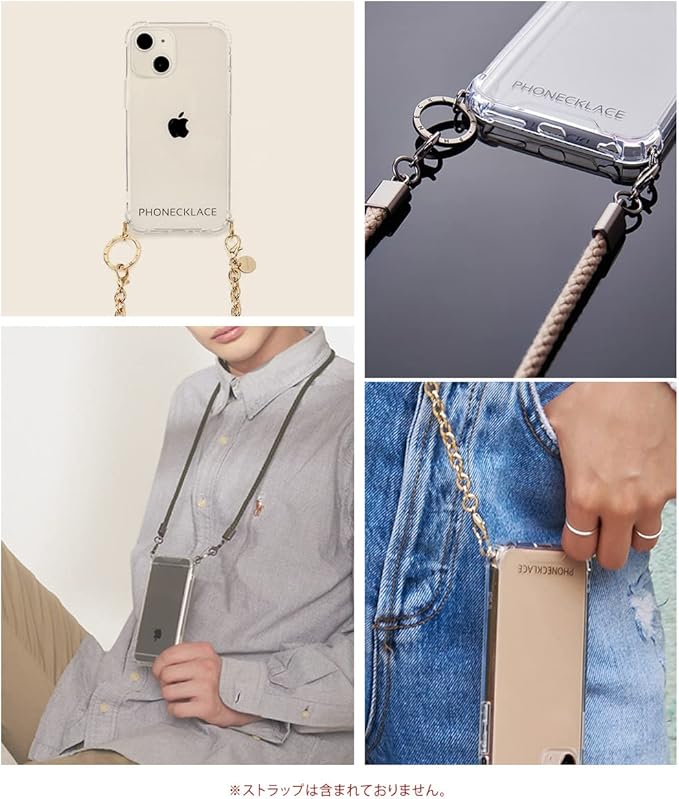 PHONECKLACE「ストラップ用リング付きクリアケース」は、スタイリッシュなチャームが付いていて、ストラップやキーチェーンなどの取り付けに適したiPhoneケースです。●ストラップ取り付け用リング付きケースにはストラップが付けられるリングがついており、お好きなストラップをつけていただけます。●スタイリッシュなロゴ入りチャームブランド名「PHONECKLACE」が刻印されたスタイリッシュなリング型のロゴ入りチャームがついており、ストラップやキーチェーンなどが取り付けやすくなっています。●着脱しやすく耐久性の高いハイブリッドケース背面は硬質で衝撃に強いポリカーボネート、フレーム部分は軟質で衝撃吸収に優れたTPUを使用しているハイブリッドケースです。耐久性が高く、ケースの着脱も簡単です。●iPhoneにジャストフィット、機能的なディテールiPhoneにぴったりサイズで作られています。マナーボタン、スピーカー、充電端子、カメラのホールが正確に開けられており、iPhoneを便利に使えます。サイドボタンは、カバー型でボタンが押しやすくほこりなどの侵入を防ぎます。●四隅のエアークッションが落下時の衝撃を吸収4つ角にエアークッションが付いているので、落下時の衝撃からiPhoneを守ります。●カメラや画面の保護設計iPhoneのディスプレイやカメラよりフレームが高くなるように設計し、置いた時に発生するスクラッチなどを防いでいます。※製品の仕様、デザインは改良などのため事前予告なしに変更する場合があります。
