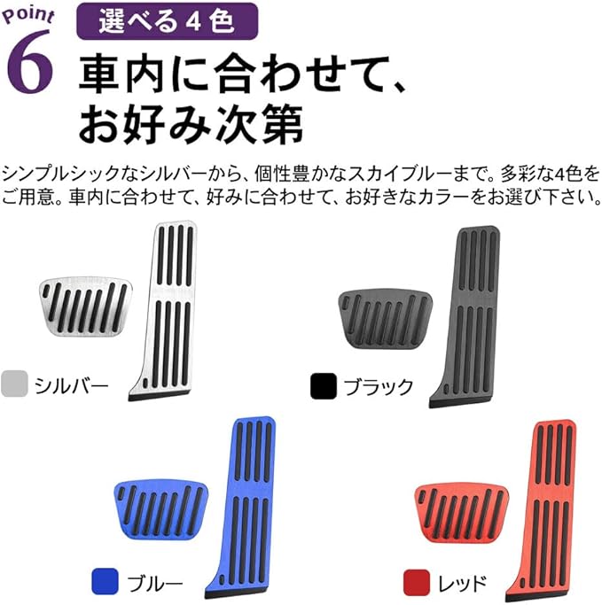 完全車種別専用設計 トヨタ対応アルミ合金ペダルカバー(2個セット) POINT.1 「専用設計」 ・実車フィッティングによる トヨタ 専用商品  まるで純正品のようなフィット感を、是非お楽しみ下さい  ぴったりフィット、走りをサポート POINT.2 「安全&安心」 ・素材には高品質アルミ合金を採用  軽量&堅固な本体に、ペダル面には3Dラバーを施工  靴~ペダル間の摩擦係数を上げることで、グリップ力をup  雨の日運転にも効果を発揮する安心設計・ペダルカバーです POINT.3 「取付簡単」 ・穴あけ&工具不要、はめ込むだけの簡単取付  届いたその日にスグ着けられる  (取付手順)   1.ペダル付属の純正ゴムカバーを外します   2.カバーを外したペダルに、本商品をはめ込みます   3.ガタつき・ユルみがないか、確認します   4.ピッタリはめ込まれていれば、取付け完了です POINT.4 「長持ち品質」 ・素材には、特製アルミ合金を採用  軽量・堅固・高耐久が特長で、見た目の質感も良い  長期に渡ってご利用頂ける、高品質ペダルカバーです POINT.5 「ドレスアップもOK」 ・ペダル表面にはこだわりのヘアライン加工を実施  ファッション性&高級感に富むので、内装パーツとしてもナイス  着ければ納得より充実した室内空間を演出するアルミカバーです POINT.6 「選べる4色」 ・車内に合わせて、お好み次第  シンプルシックなシルバーから、個性豊かなブルーまで  多彩なカラーをご用意しました 専用カバーで、快適ドライブ あなたの「走る」を、楽しくサポート 完全フィット、専用ペダルカバーです ・商品名:ペダルカバー(トヨタ専用)*2個セット ・セット内容:アクセルペダルカバー 1、ブレーキペダルカバー 1 ・素材:アルミ合金、滑り止め3Dラバー ・カラー:シルバー、ブラック、レッド、ブルー 本製品は「トヨタ」専用設計ですご注文の際は、お車仕様ご確認の上、お間違いのないようお願い致します