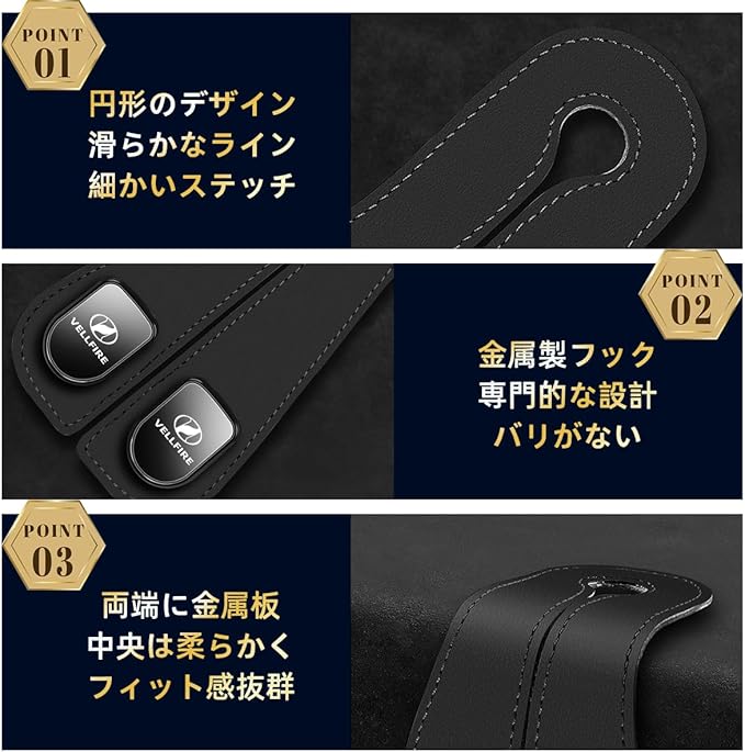 【高品質】ヴェルファイア シートフックは、上質なPUレザーで作られており、触り心地が滑らかで柔らかいです。便利なデザインを採用し、先端と末端には頑丈な金属板が内蔵されているため、耐久性に優れています。使用中にロープのようにねじれることがなく、非常に使いやすいです。対応 Vellfire ヴェルファイア 20系 30系 40系。