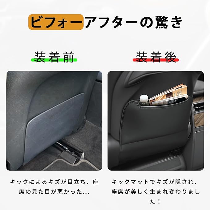 2.【多機能】キックガードを使って、大切な愛車のシート汚れをガッチリガード!ご愛車はいつまでも新しく、きれいな状態を保ちましょう~また、納ポケットがついており、いろいろ小物をしっかり収納可能です。収納スペースが広がり、旅行にも便利です。