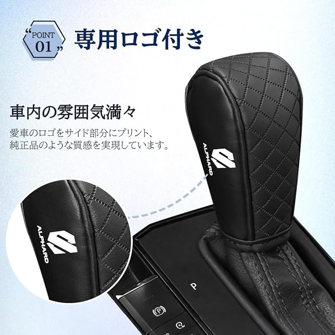 【高級感・こだわり対応】 このシフトグリップカバーはアルファード専用グッズとして専用ロゴ付きで高級感アップ、車内の雰囲気に完璧に溶け込み、シックでカッコ良く仕上がります。愛車をこだわって彩りたい方に贈る、おしゃれで上質なインテリア。心地よい空間が毎日のドライブを快適に。