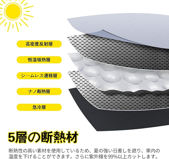 多層構造]:冬場、窓からの冷気の侵入を防ぎ、車内の温度を保ち、車中泊を快適にします。エアコンの効率を向上させ、エネルギーを節約。従来品に比べ、遮光・断熱性能が大幅に向上し、夏は低温、冬は高温になる。空調効率を向上させ、省エネを実現します。ブラックメッシュ仕上げ。