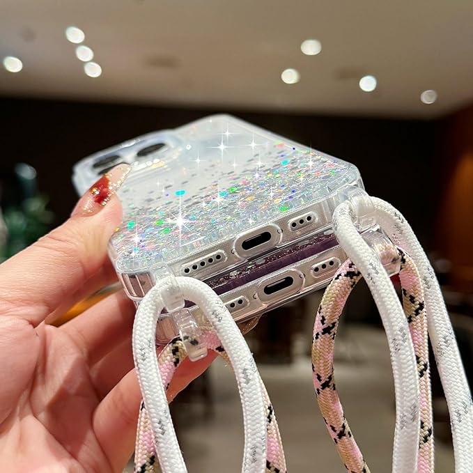 LCHULLE 用の iPhone 15 Pro Max ケース キラキラ ラメ ショルダー ストラップ付き カバー かわいい グリッター 女の子 韓国 おしゃれ 斜めかけ 肩掛け 軽量 耐衝撃 TPU 落下防止 ネックストラップ 長さ調整可能 用の アイフォン 15 Pro Max スマホケース(透明)
