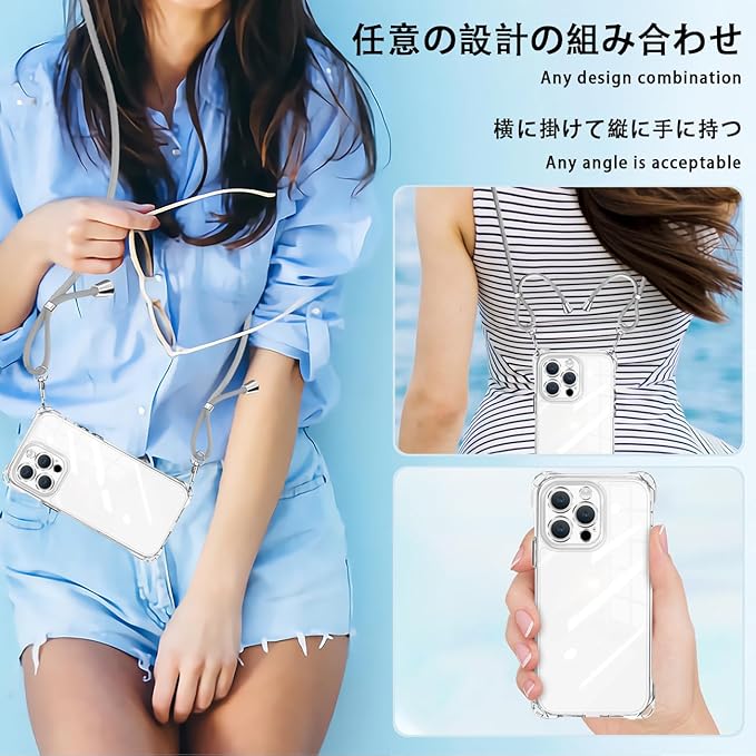 iPhone 16 Pro Max 用の ケース クリア 肩掛け斜めかけ 首掛け縄掛け アイフォン16ProMax スマホケース カバー ショルダー 透明 バンパーカバー 耐衝撃 ワイヤレス充電対応 斜めがけ 縄掛け 長さ調整可能 薄型 落下防止 縦/横 紛失防止 可愛い(グレー)