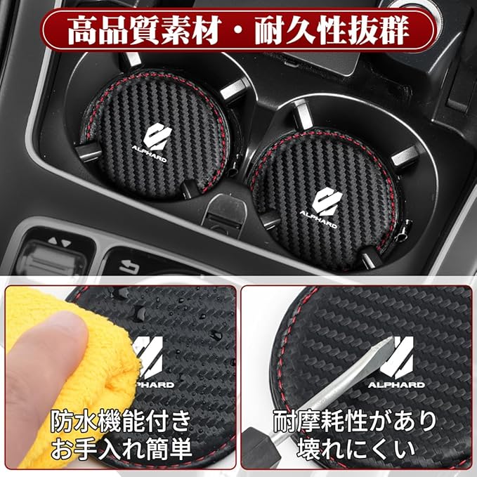 アルファード 適用 車 ドリンクホルダー コースター 断熱 アルファード 20系 30系 40系 対応 騒音軽減 ドリンクホルダーを保護 防水防汚 車用 コップマット 取っ手付き 滑り止め 振動防止 カー 耐久性 内装パーツ 丸型 2枚入り(アルファード 適用,カーボン調)