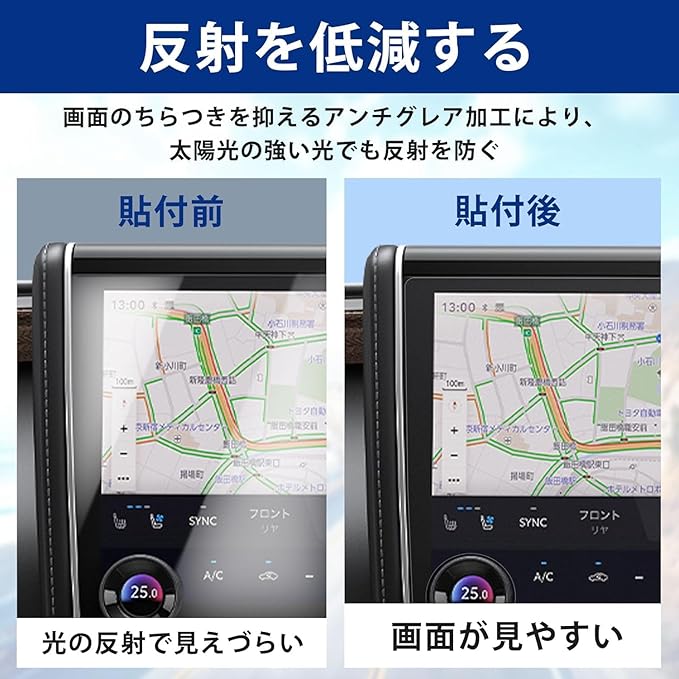 アンチグレア:当製品(アルファードヴェルファイア40系ナビ用の保護フィルム)には、アンチグレア加工が施されているので、蛍光灯や日光等による反射が効果的に抑えられ、ナビの画面が見やすくなります。