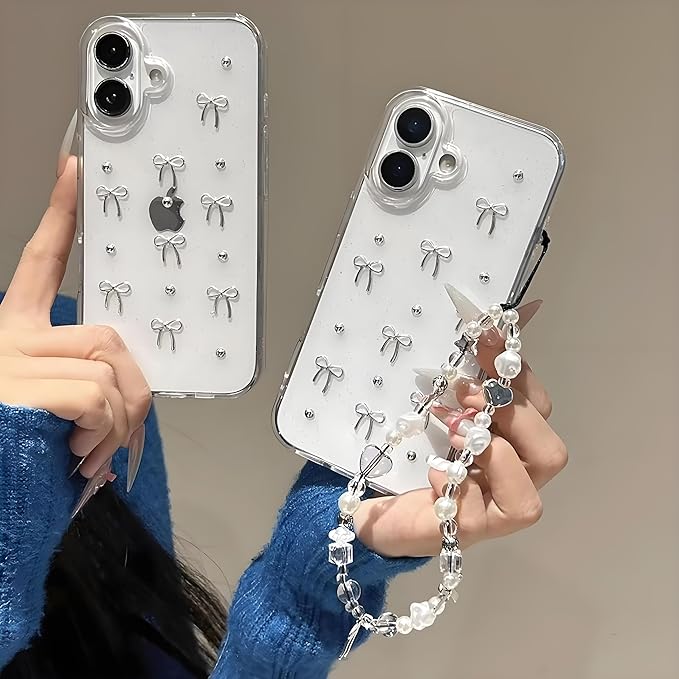 【透明感が高くで可愛らしいリボンケース】シルバーの小さなリボンとパール、控えめなラメが散りばめられた、大人可愛いiPhone用クリアケースです。シンプルながらもゴージャスな雰囲気を演出します。透明なデザインでiPhone本体のカラーやデザインを損なわず、さりげなくおしゃれを楽しめます。 【立体的なリボンとパールパーツ】 リボンやシルバーのボールは立体的で、触っても手に馴染むデザイン。しっかりとコーティングされており、衣類などに引っ掛ける心配も少なく安心です。