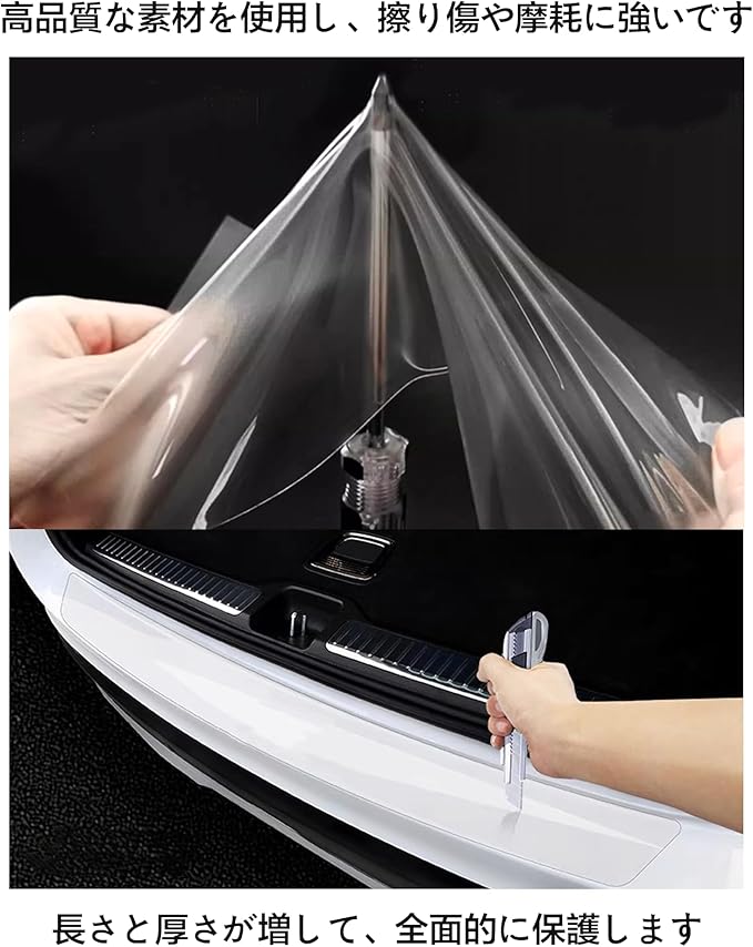 本製品は自動車のトランクステップに使用する保護フィルムで、透明タイプの1本入りです。荷物の運搬時にトランクステップの塗装が傷つくのを効果的に防ぎ、日常の車の使用をより安心して楽しめるようにします。