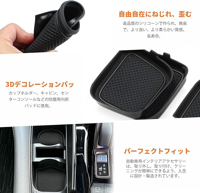 【シリコーン製ドリンクホルダートレイ】耐熱/耐寒性が高い、滑りにくく安定性があり、振動を吸収しやすいため、安定感が出る。 お手入れが簡単、汚れが付きにくく、洗いやすい。