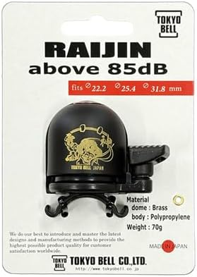 雷神(RAIJIN):「雷神」が轟かす大きな雷鳴が、遠くまで鳴り響く音を連想し製品名称に。 ・国内規格JISと国際規格ISOをクリアしており85dB 以上の音圧です。 ・スポーツバイクに乗られる、より幅広いユーザーに雷神ベルを使用していただきたく、 O-ring ゴムを使用しハンドル取付径φ22.2/φ25.4/φ31.8mmに取付可能な製品開発を行ないました。 ・高速走行中に危険防止の為にベルを使用する際に、大きな音圧で離れた距離まで音が確認出来ます。 ・高品質の大きな音で、自転車に乗るあなたに大きな安全を。