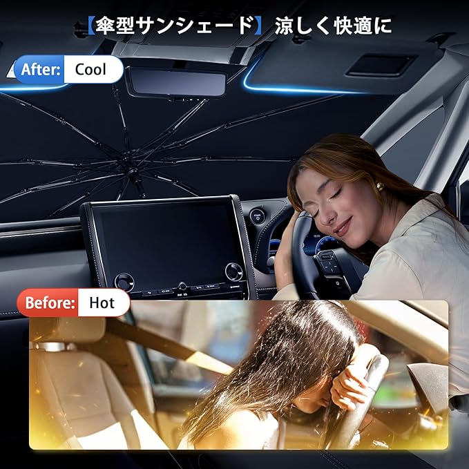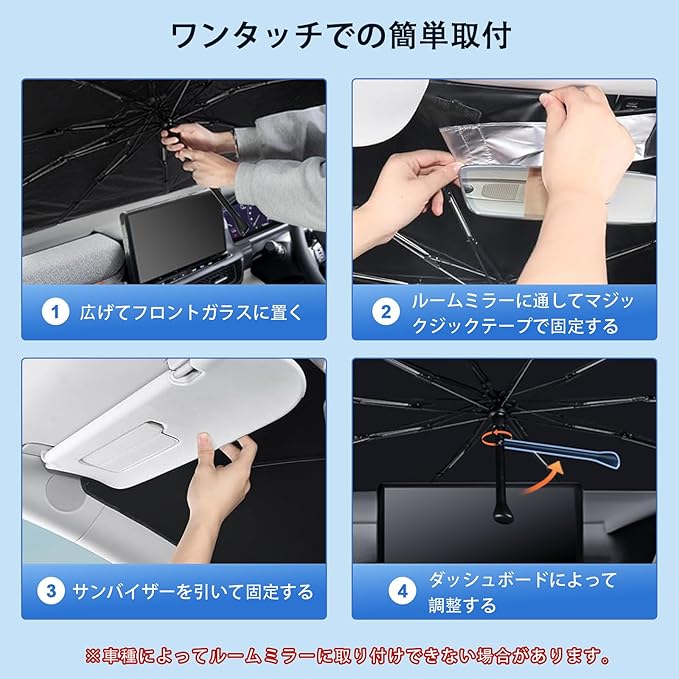【傘型デザインで設置も収納も楽々】吸盤を使わず、傘を開くようにパッと広げて、サンバイザーを下げて挟むだけで簡単に取り付けできます。シンプルな傘式デザインでコンパクトに折り畳めるので収納しやすいです。デザイン性と機能性を両立した便利な折りたたみ傘式サンシェード。