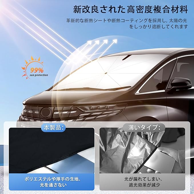 【次世代のUVカット特殊生地】サンシェードは表面が銀色で裏面が黒色となっており、強い日差しを効果的に遮ることができます。高密度複合材料を使用しており、熱を遮断して太陽光を反射し、車内を涼しく快適な空間に保ちます。また、当店のフロントサンシェードは光を通さない厚手の生地が採用され、車中泊や仮眠時の目隠しなどサンシェードで車内を快適に過ごせます。夏場の紫外線対策と熱中症対策に最適です。