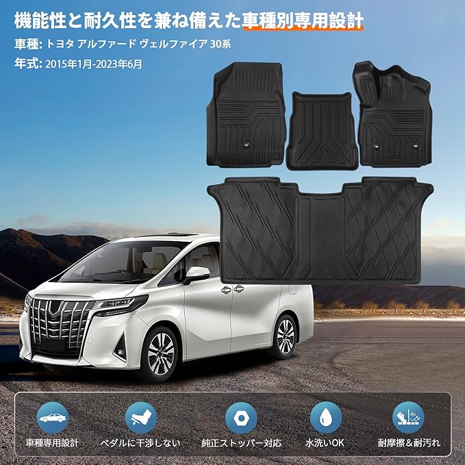 【高級感溢れる上質なTPE素材】アルファード ヴェルファイア 30系のフロアマットは、優れた防水性能と耐摩耗性を持つ高品質のTPE素材を採用し、傷や汚れを防ぎます。また、マット表面は凹凸仕様で、足元の滑りを防ぎ、裏面にはズレを防止する固定フック付き、前後にズレることなく、運転中の安全性を高めます。なお、重厚感溢れる「黒」のフロアマットが車内に洗練された印象と高級感を与えます。
