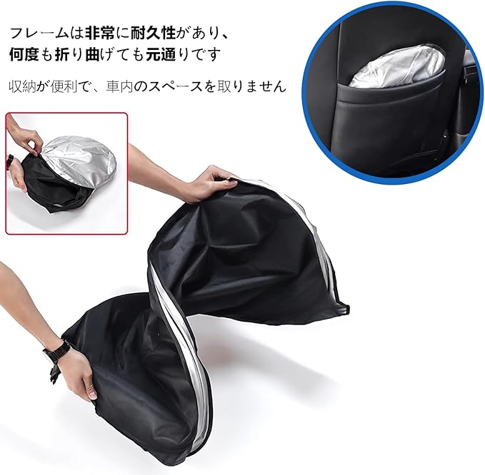 取り付けが簡単:記憶合金の支持架が内包されており、取り出すと自動的にあなたの車のフロントウィンドウガラスと同じサイズに復元されます。車内のメイクアップミラーの支持架を使用して固定し、傘の骨がない設計で、愛車の内装を傷つけることがありません。