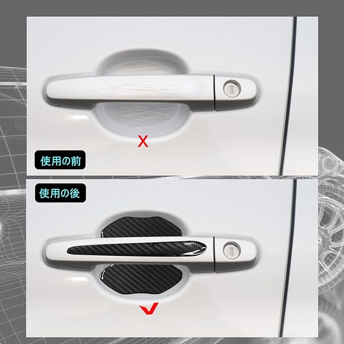全面的な保護: この製品は車のドアカップとドアハンドルの保護フィルムセットで、ドアハンドル全体を包括的に保護し、車のドアの開閉による傷や汚れ、その他の潜在的な損傷から効果的に防ぎます。車のペイントを美しく保ちます。