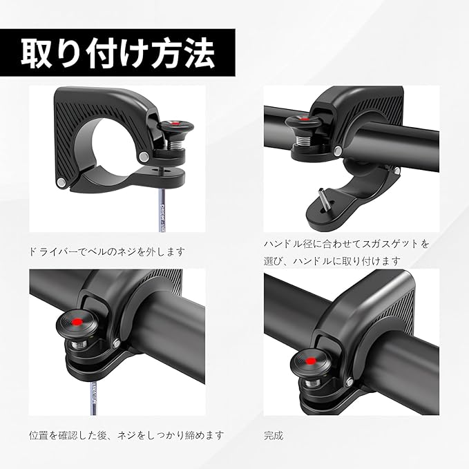【簡単取り付け&幅広い自転車に対応】軽量コンパクトなボディで、重量約40g、ハンドル内径22mm~32mmのほとんどの自転車に簡単取り付け可能。角度自由調整ができ、使いやすい位置にセットして快適なライディングを実現します。ロードバイク、マウンテンバイク、クロスバイク、折りたたみ自転車、ママチャリ、子供用自転車、シティサイクルやキックボードなどに適しています。(※ご注意:購入する前に愛車のハンドル径が合うかご確認下さい)