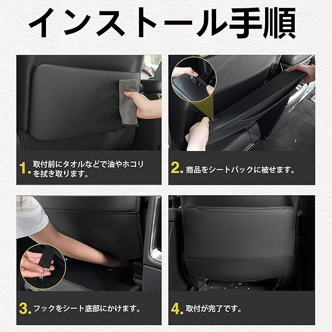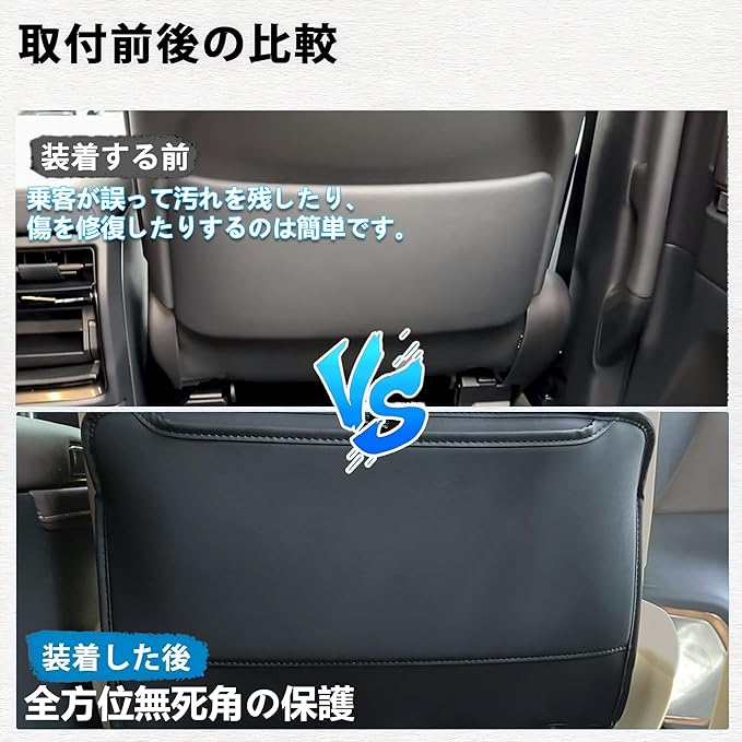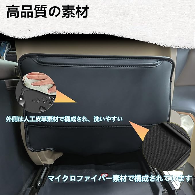 強力防汚プロテクション:お子様の靴跡や荷物の接触からシートバックを徹底ガード! 高密度人工皮革が液体・汚れをはじき、シートの経年劣化を防ぎます。車内をいつも「新車の状態」に保つキックガードです。