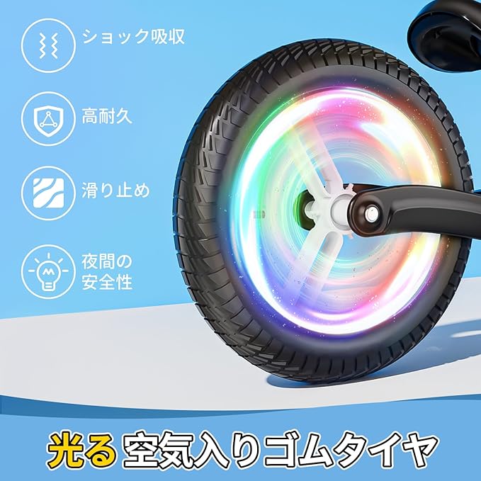 【安心のEVAタイヤとベル付き】 軽量で防刺穿のEVAフォームタイヤを装備しており、さまざまな地形でスムーズなライディング体験を提供します。空気を入れる必要がなく、メンテナンスの手間を減らし、子供がいつでもどこでも安心して乗ることができ、アウトドアアクティビティを存分に楽しむことができます。さらに、ベル付きは子供たちがライディング中に音を発することで、周囲の歩行者や車両に注意を促すことができます。また、ライディング中に楽しさを感じることができるデザインです。