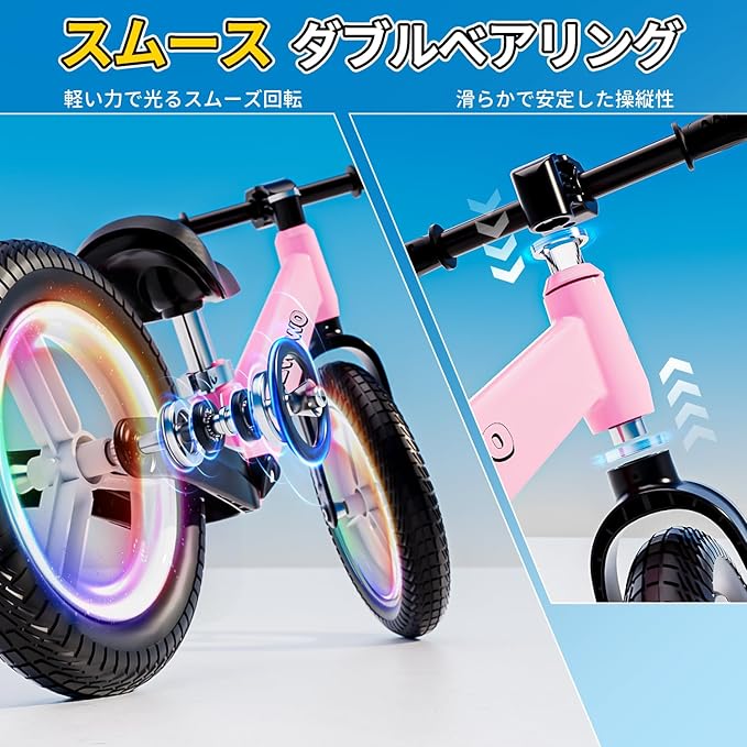 【軽量で耐久性のある高品質フレーム】 このペダルなし自転車はガラス繊維強化ナイロンフレームを採用し、強度は炭素鋼と同等で、50kgまでの重量に耐えられ、わずか3.2kgの軽さです。軽量で耐腐食性があり、親が持ち運ぶのにも便利で、特に家族のお出かけに最適です。