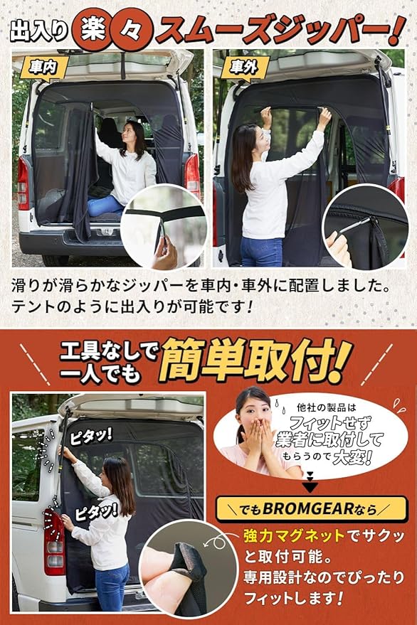 ✅【車内・車外両面のスムーズジッパーで楽々出入り】車内と車外の両側にジッパーを配置。軽い力でスルスルと開閉でき、出入りのたびにマグネットを剥がす手間がありません。