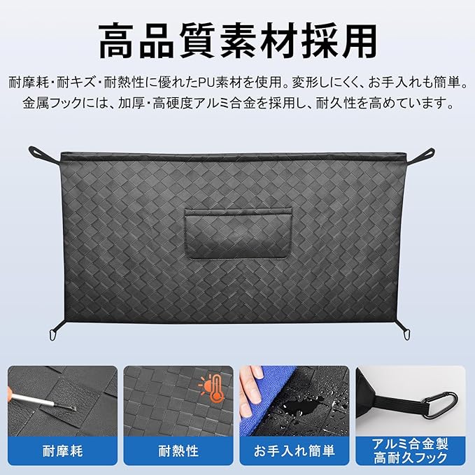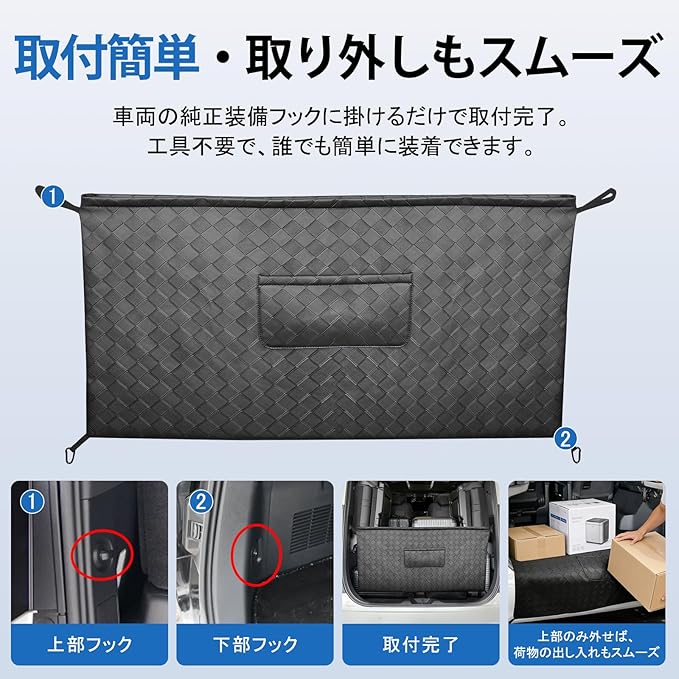 4.【工具不要・簡単取付|初心者でも安心】 取り付けは、収納バッグに付属するカラビナをラゲッジ左右の金属フックに掛けるだけ。工具・加工は一切不要で、初めての方でも短時間で簡単に装着できます。しっかり固定されるため、走行中もズレにくく安心してご使用いただけます。
